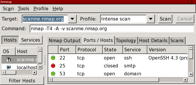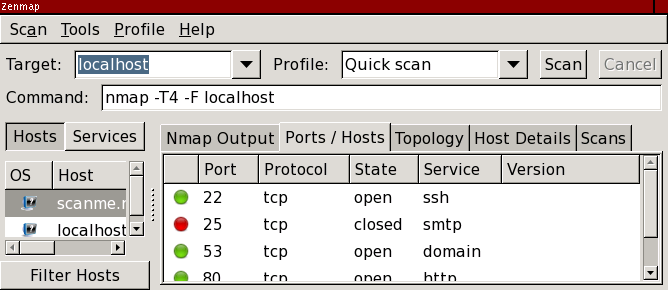 Now scanme has a little penguin icon showing that its operating system has been detected as Linux. Additionally one of its services has been identified. Now we're doing something you can't do with a single Nmap scan, because you can't single out a host for more intense scanning like we did. The results for localhost are still present, though we won't know more about it than we did before unless we decide to do a more in-depth scan.